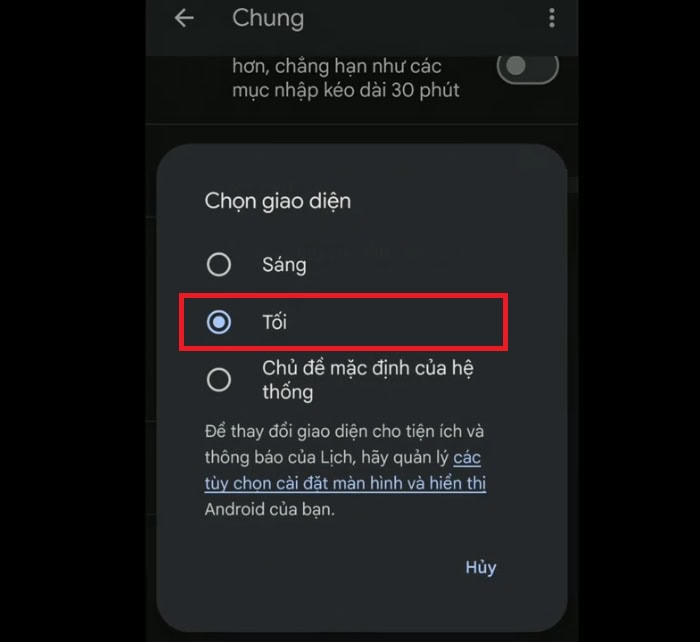 Nếu điện thoại của bạn hỗ trợ chế độ tối toàn hệ thống, bạn chỉ cần chọn mục Mặc định của hệ thống trong phần cài đặt. Lúc này, chế độ tối ở bảng điều khiển nhanh của điện thoại (thường vuốt từ trên màn hình xuống), ứng dụng Google Calendar sẽ tự động đổi màu theo mà không cần thao tác lại.