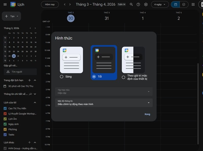 Cuối cùng, bạn hãy tận dụng tính năng Mật độ và màu sắc trong cài đặt. Google cho phép bạn chọn giữa hai phong cách Hiện đại và Cổ điển. Đối với Dark Mode, bạn nên chọn hiện đại để giảm bớt các đường kẻ, giúp không gian lịch trông thoáng đãng hơn, tránh cảm giác tù túng khi nhìn vào màn hình đen trong thời gian dài.