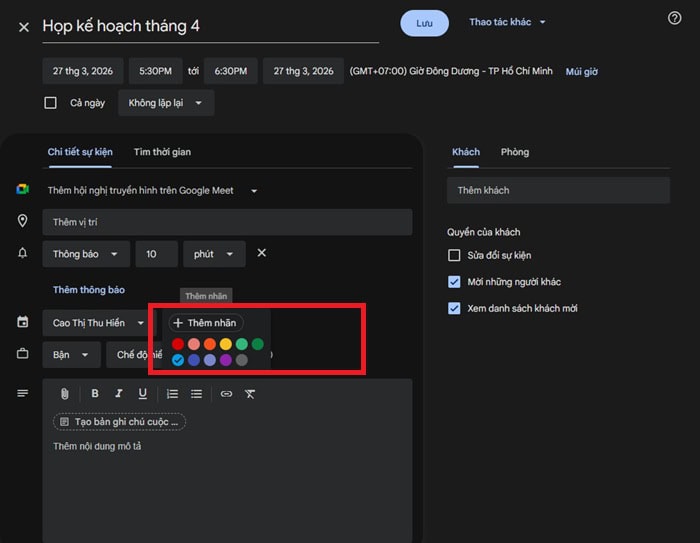 Bạn hãy nhấp chuột phải vào một sự kiện bất kỳ, Google sẽ hiện ra bảng màu. Bạn nên chọn màu Xanh xám (Lavender), Xanh lá thông (Sage), hoặc Hồng tro (Flamingo). Những màu này khi đặt trên nền tối sẽ tạo ra sự tương phản dịu nhẹ, giúp bạn dễ dàng đọc nội dung mà không bị chói.