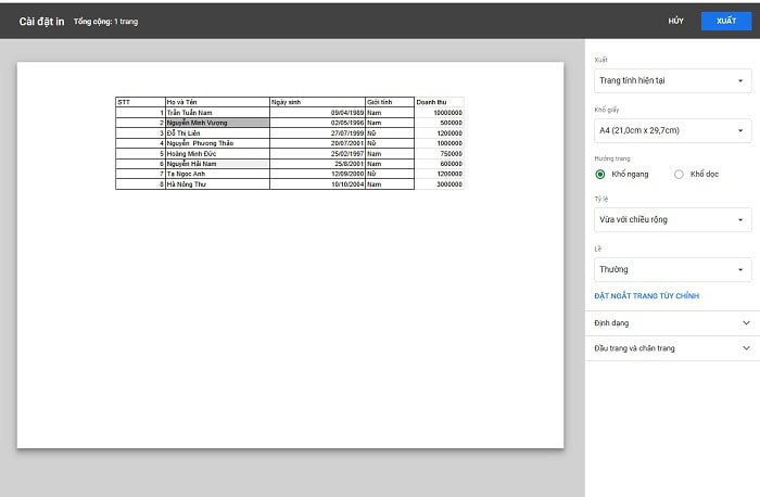 - Phần Định dạng (Formatting): Tại đây, bạn tùy chỉnh Cỡ giấy (A4, Letter, v.v.), Hướng trang (Dọc/Ngang), và đặc biệt là Tỷ lệ (Scale) – yếu tố quyết định bảng tính có bị cắt xén hay không. Nên chọn Vừa với chiều rộng (Fit to width) để đảm bảo tất cả các cột đều hiển thị trên một trang.