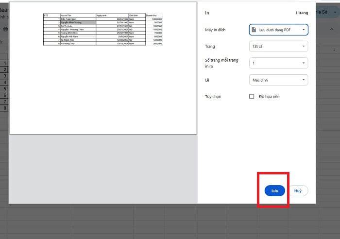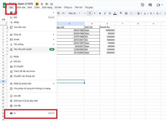 Các bước chi tiết sử dụng lệnh In để chuyển đổi Google Sheets thành PDF: