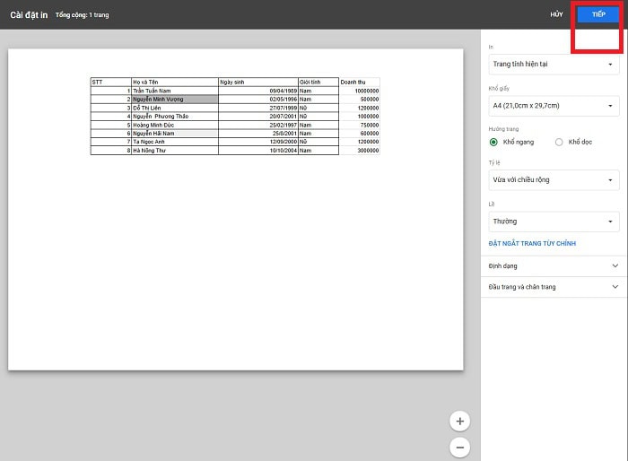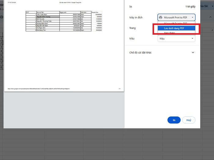 – Bước 3: Sau khi tùy chỉnh xong trong Google Sheets, bạn nhấn Tiếp (Next) (hoặc tương đương). Thao tác này sẽ mở ra hộp thoại In chuẩn của trình duyệt web.