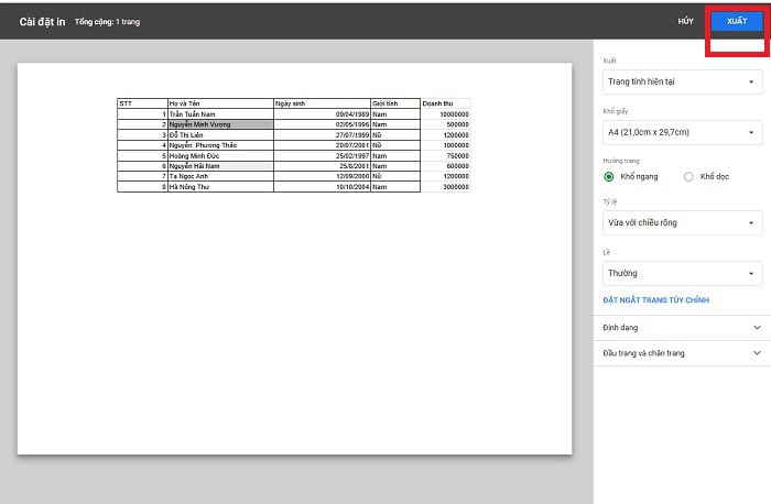 – Bước 6: Xem trước file PDF ở cửa sổ bên trái, nếu mọi thứ đã hoàn hảo, bạn nhấn nút Xuất (Export) màu xanh. File PDF sẽ được tải về thư mục mặc định trên máy tính của bạn.