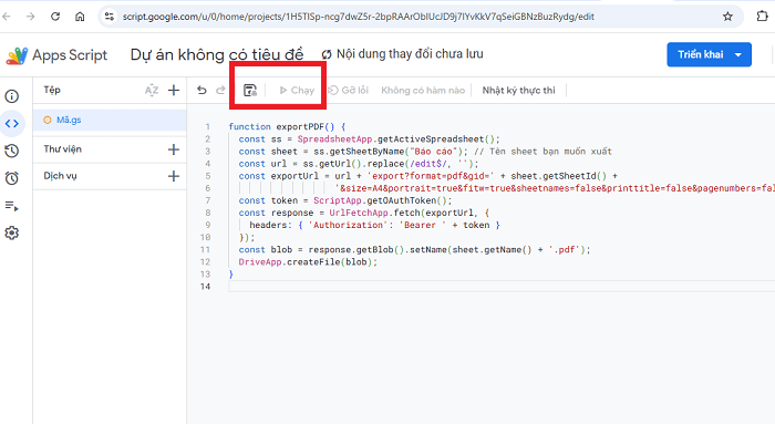 Các bước cơ bản để thiết lập Script chuyển đổi Google Sheets thành PDF như sau: