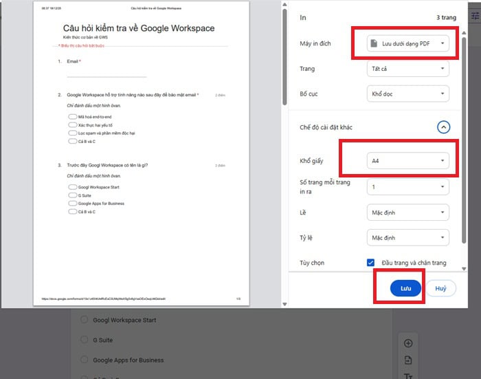 – Bước 4: Trước khi nhấn Lưu, bạn hãy kiểm tra mục Khổ giấy (thường chọn A4) và Tỷ lệ. Nếu biểu mẫu của bạn có nhiều câu hỏi dài, hãy chắc chắn rằng mục Đồ họa nền (Background graphics) đã được tích chọn để các màu sắc và hình ảnh trang trí của Form được giữ nguyên.