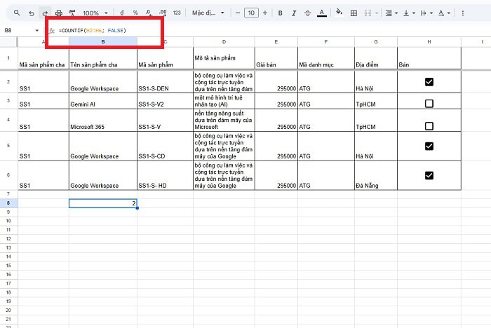 Cách đếm ô checkbox trong Google Sheets bằng hàm COUNTIF