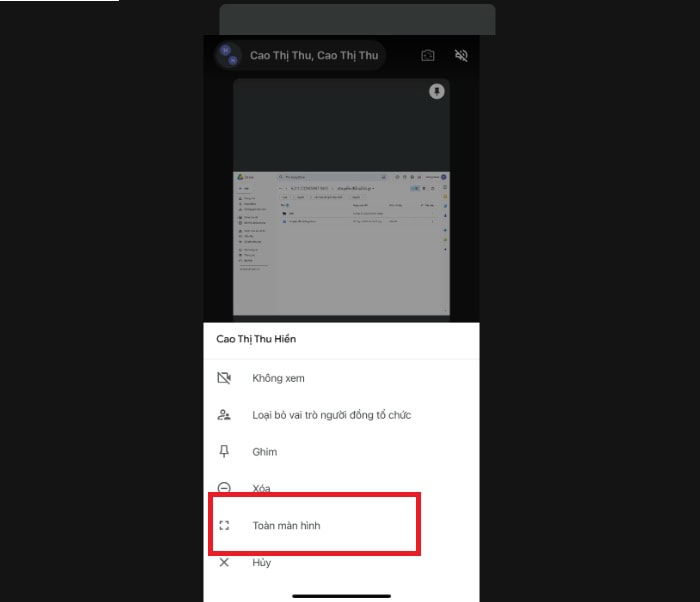 Trong danh sách thành viên, bạn có thể nhấn vào khung từng người. Sau đó, bạn chọn vào mục Toàn màn hình là xong.