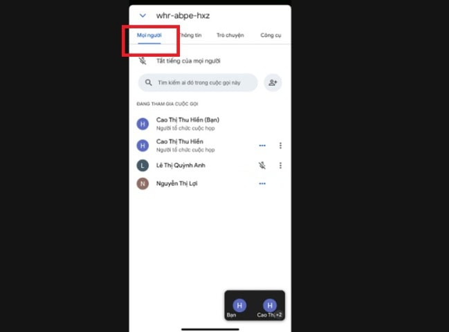 Nhấn vào Tên cuộc họp (hoặc mã cuộc họp) ở phía trên cùng màn hình >> Chọn tab Mọi người (People).