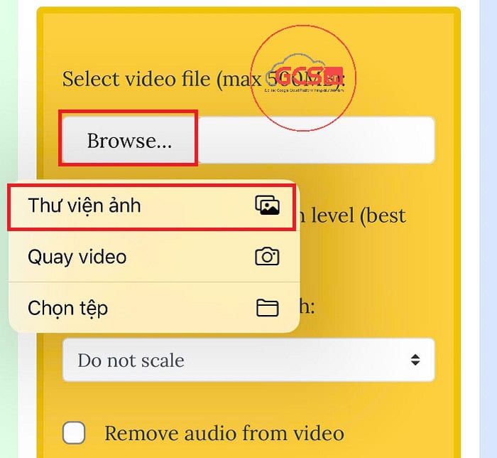 Trên trang chủ của Video Smaller, bạn sẽ thấy nút Browse… hãy nhấn vào đó. Hệ thống sẽ hỏi bạn muốn chọn tệp từ đâu Thư viện ảnh, Quay video hoặc Chọn tệp >> chọn Thư viện ảnh.