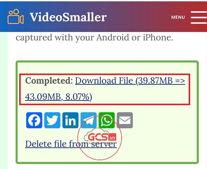 Sau khi quá trình hoàn tất, trang web sẽ hiển thị thông báo Compression complete và một liên kết để Download File. Nhấn vào liên kết đó để tải video đã nén về điện thoại để lưu vào thư mục Tải về trên điện thoại.