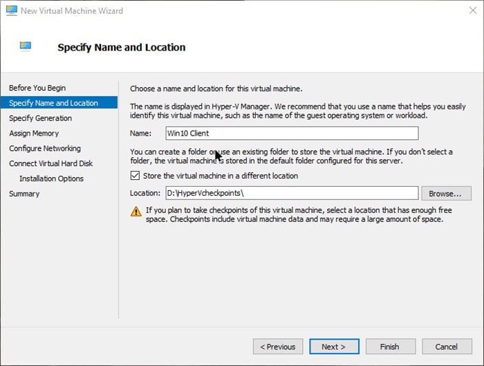 Tiếp tục, bạn hãy nhập tên cho máy ảo, chọn thư mục lưu trữ VHDX (ổ đĩa ảo) để dễ quản lý và nhấn Next.