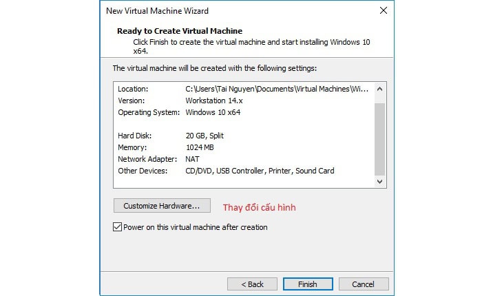 Bạn hãy nhấn Customize Hardware nếu muốn thay đổi cấu hình RAM, số CPU, mạng, card đồ họa… Lưu ý, tổng tài nguyên chia cho máy ảo không vượt quá 50% tài nguyên máy thật. Ví dụ: máy thật 4GB RAM >> máy ảo tối đa 2GB RAM, CPU 4 nhân >> máy ảo tối đa 2 nhân.