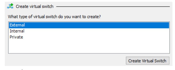 Trong Virtual Switch Manager, chọn External để máy ảo có thể truy cập Internet thông qua card mạng vật lý của máy chủ. Bạn hãy nhấn Create Virtual Switch để xác nhận.