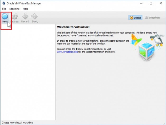 Đầu tiên, bạn cần mở VirtualBox và chọn New. Đây là bước đầu tiên để tạo một VM mới trên Windows 10.