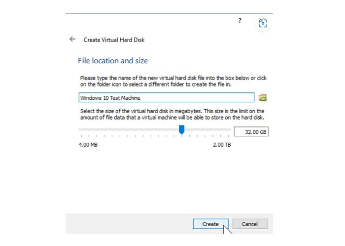 Bạn chọn tiếp mục thư mục lưu >> nhấn Create để hoàn thành việc tạo ổ cứng ảo.
