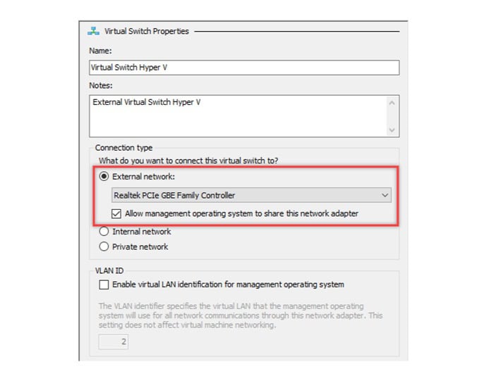 Sau đó, bạn cần đặt tên cho Virtual Switch và tích vào Allow management operating system to share this network adapter nếu bạn muốn hệ điều hành host cùng sử dụng mạng.
