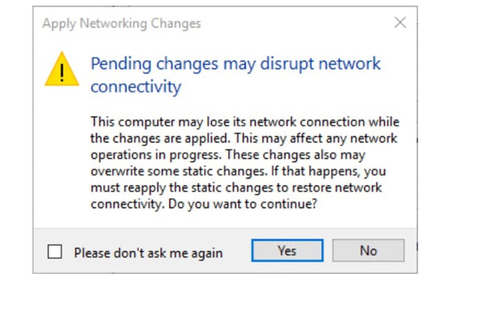 Hệ thống sẽ cảnh báo khả năng gián đoạn kết nối mạng tạm thời, nhấn Yes để tiếp tục.