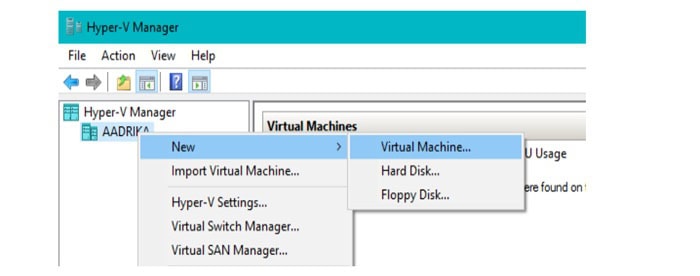 Tiếp tục, bạn hãy nhấp chuột phải vào tên server trong Hyper-V Manager, chọn New >> chọn Virtual Machine Wizard.