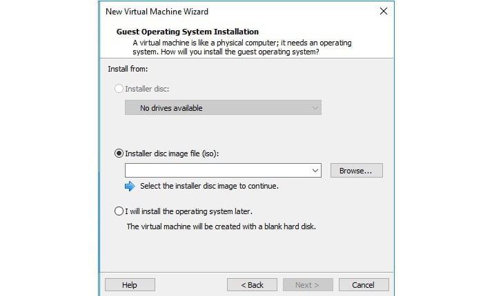 Bạn cần chọn Install an operating system from a bootable file, sau đó duyệt đến file ISO hệ điều hành bạn đã chuẩn bị. Tiếp tục, bạn nhấn Next để hoàn tất cấu hình cài đặt ban đầu.