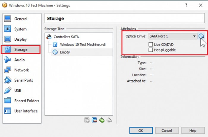 Để cài Windows 10, bạn cần gắn file ISO bằng cách chọn máy ảo >> chọn Settings >> vào mục Storage >> chọn biểu tượng ổ đĩa CD dưới “Controller: IDE” >> nhấn biểu tượng đĩa nhỏ (Choose a disk file) >> chọn file ISO Windows 10 trong máy >> nhấn OK để lưu lại.