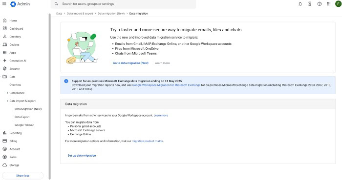 Google sẽ ngừng hỗ trợ công cụ di chuyển dữ liệu cũ (Legacy Data Migration Service) cho việc chuyển email, lịch và danh bạ từ các máy chủ Microsoft Exchange on-premises. Kể từ ngày 31 tháng 5 năm 2025, Google khuyến nghị quản trị viên sử dụng công cụ Google Workspace Migration for Microsoft Exchange (GWMME) để thực hiện việc di chuyển này.