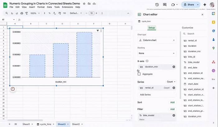 Bản cập nhật mới của Connected Sheets trong Google Sheets mang đến khả năng tạo nhóm tùy chỉnh cho dữ liệu số trong biểu đồ. Với việc kiểm soát được giá trị tối thiểu, tối đa và kích thước khoảng của mỗi nhóm, người dùng có thể trực quan hóa dữ liệu lớn một cách hiệu quả hơn, dễ dàng phân tích và khám phá các thông tin giá trị ẩn sâu trong tập dữ liệu của mình.