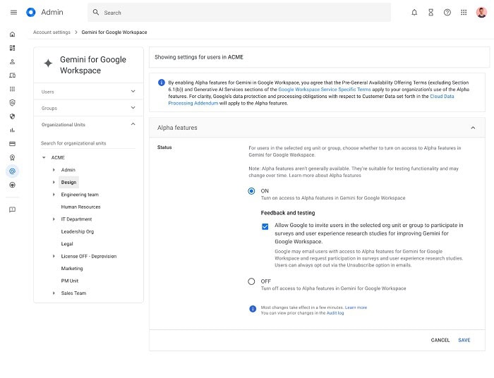 Ngoài ra, quản trị viên có thể bật quyền truy cập vào các tính năng alpha của Gemini cho tất cả người dùng hoặc một nhóm người dùng cụ thể trong các Đơn vị tổ chức (Organizational Units – OUs) hoặc Nhóm.