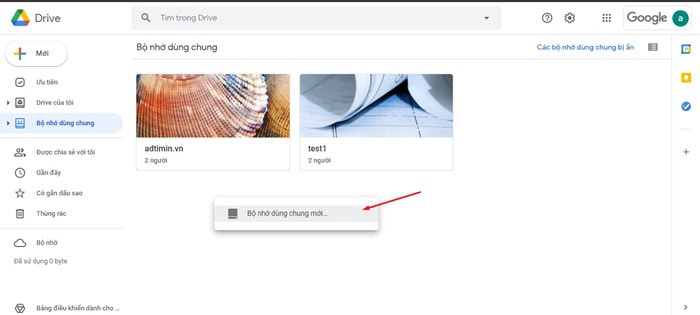 – Bước 1: Đầu tiên, bạn cần truy cập drive.google.com. Ở menu bên trái, bạn sẽ thấy mục Bộ nhớ dùng chung (Shared Drives) nằm ngay dưới My Drive.