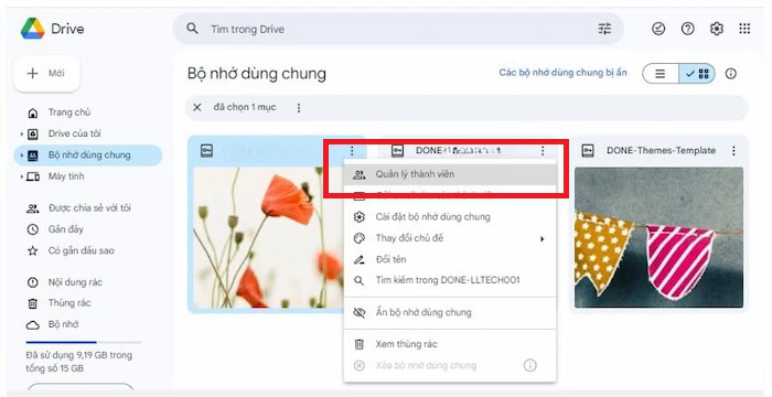– Bước 1: Mở bộ nhớ dùng chung (Shared Drive) mà bạn đã tạo trước đó. Ở góc trên bên phải, nhấn vào nút Quản lý thành viên (Manage members).