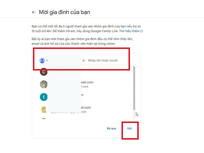 – Bước 2: Nhập địa chỉ Gmail của người bạn muốn chia sẻ (tối đa 5 người, tổng cộng nhóm là 6 người).