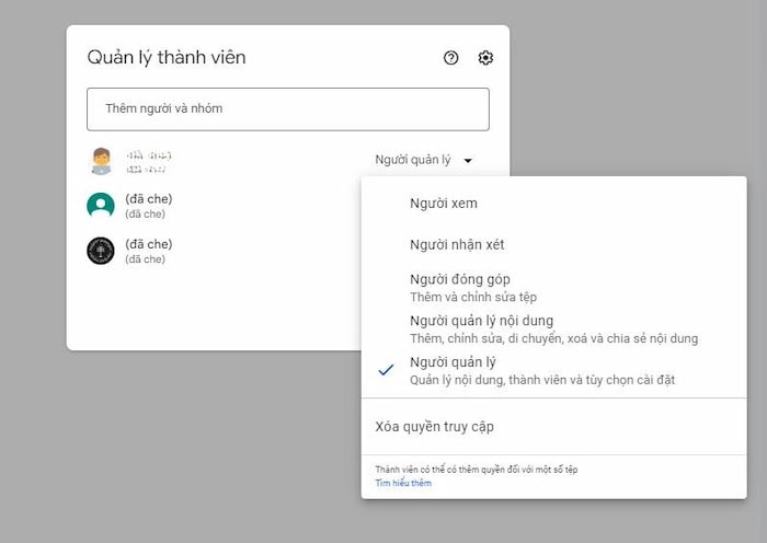 Trong Shared Drive, quản trị viên có thể thiết lập nhiều mức quyền khác nhau như: