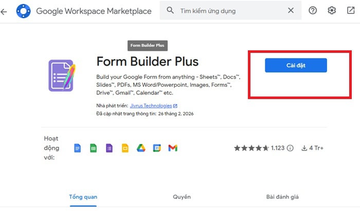 Sau đó, nhập từ khóa Form Builder Plus vào ô tìm kiếm và nhấn chọn ứng dụng >> chọn Cài đặt để tích hợp tiện ích vào Google Forms.