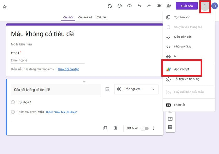 Tại giao diện Google Forms, nhấn vào biểu tượng ba chấm (⋮) ở góc trên bên phải >> chọn Trình chỉnh sửa Apps Script. Hệ thống sẽ mở một cửa sổ mới, cho phép bạn nhập đoạn mã cần thiết.