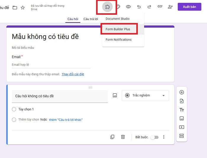 Bạn mở tệp Google Forms cần thêm câu hỏi và nhấn vào biểu tượng Tiện ích bổ sung (hình mảnh ghép) trên thanh công cụ.