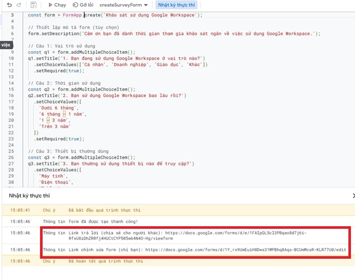 Sau khi chạy xong, bạn sẽ nhận được link Google Forms với 1 link xem (view) và 1link chỉnh sửa (edit).