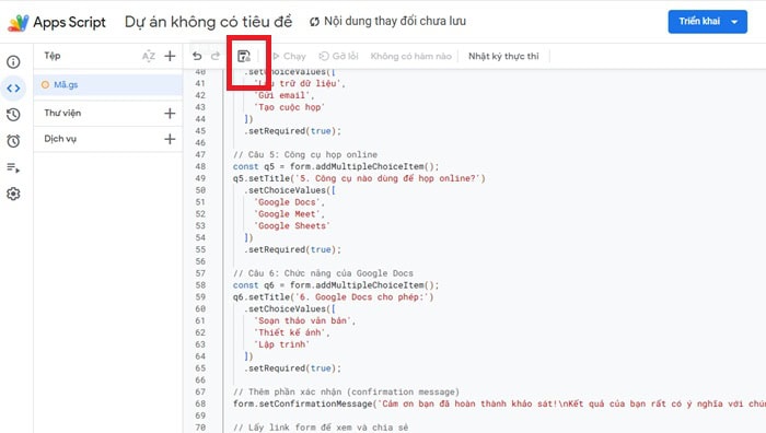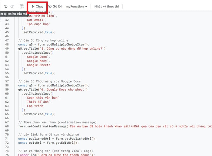 – Bước 8: Chạy script để tạo Google Forms