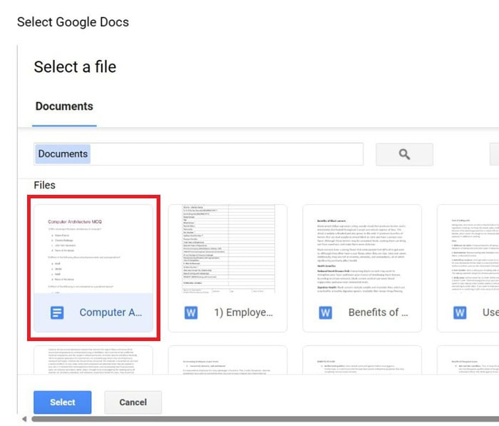 Sau đó, bạn hãy chọn nguồn dữ liệu là Google Docs trong bảng điều khiển và tìm đúng tệp tài liệu chứa nội dung bài kiểm tra.