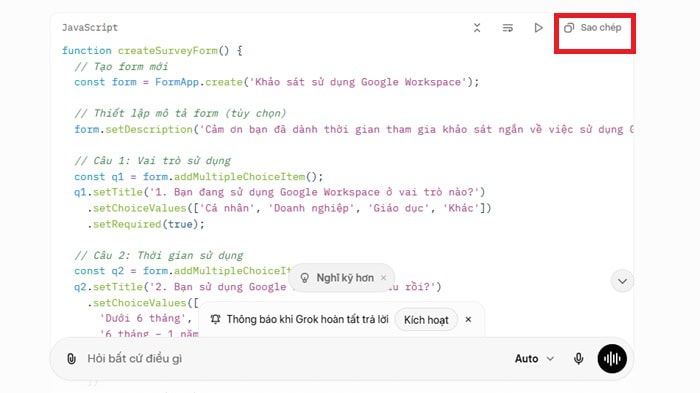 Sau vài giây, Grok AI sẽ trả về một đoạn mã script hoàn chỉnh. Bạn chỉ cần copy toàn bộ đoạn mã này, giữ nguyên nội dung không chỉnh sửa.