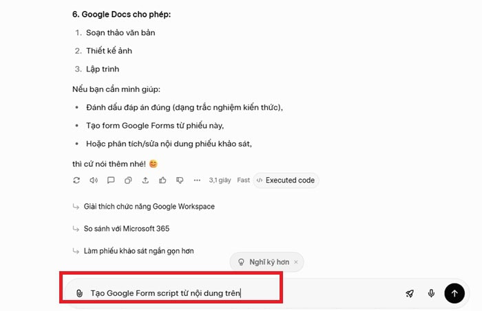 – Bước 4: Yêu cầu AI tạo Google Form Script