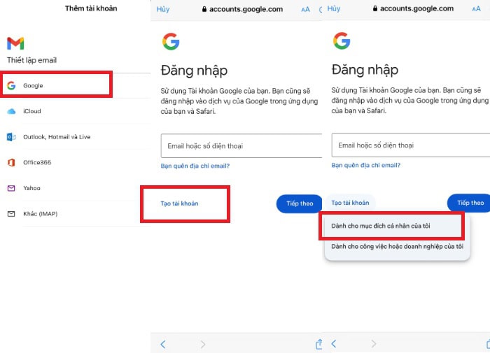 Tại đây, bạn bấm vào mục Google >> sau đó chọn Tạo tài khoản >> nhấn Dành cho mục đích cá nhân của tôi.