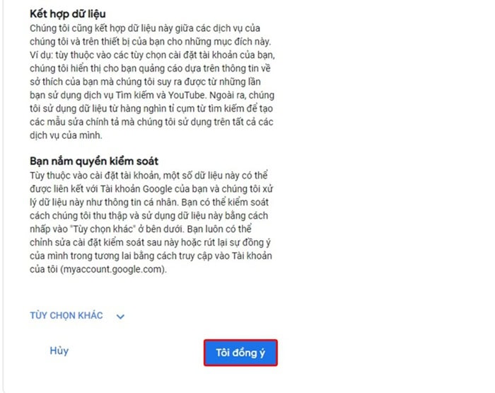 Cuối cùng, bạn đọc và nhấn Tôi đồng ý để xác nhận các điều khoản sử dụng của Google.