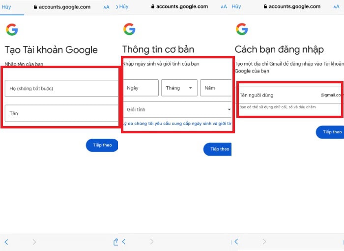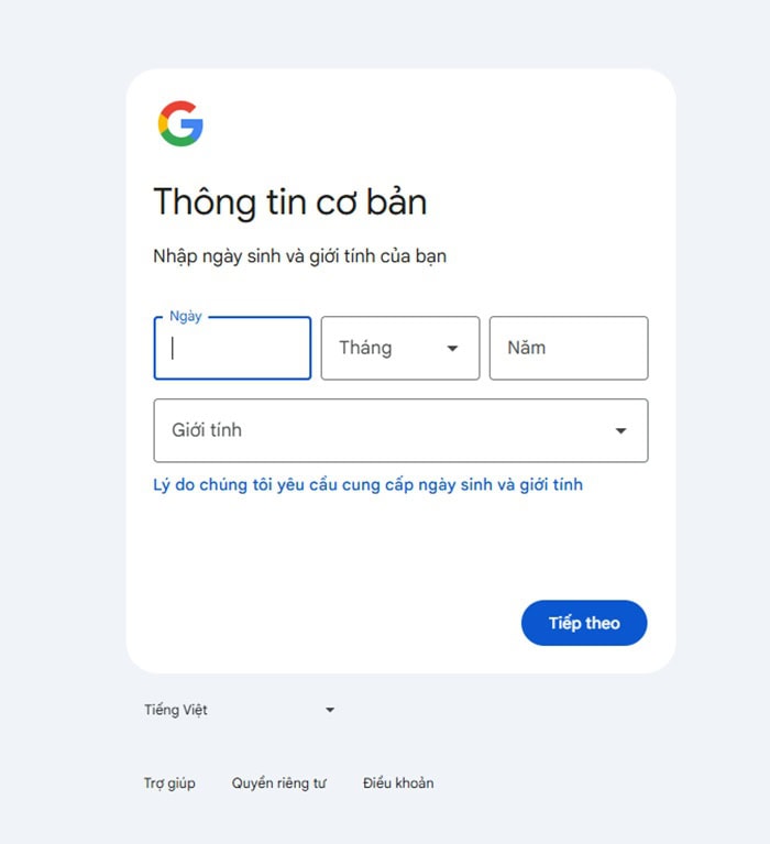 – Bước 3: Ở bước này, Google sẽ yêu cầu bạn nhập các thông tin cơ bản như Họ và tên, Ngày tháng năm sinh, Giới tính.