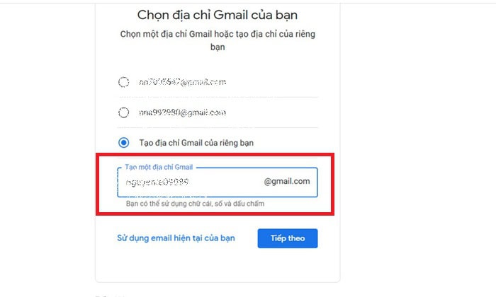– Bước 4: Sau khi hoàn tất thông tin cá nhân, bạn sẽ được yêu cầu đặt tên tài khoản Gmail. Bạn có thể chọn một trong các gợi ý của Google hoặc tự tạo địa chỉ email theo ý muốn.