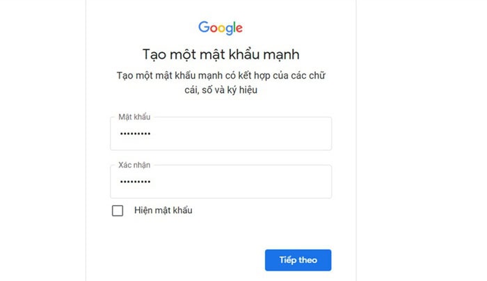 Tiếp theo, bạn hãy nhập mật khẩu và xác nhận lại để hoàn tất. Lưu ý nên sử dụng mật khẩu đủ mạnh, kết hợp chữ hoa, chữ thường và số để tăng độ an toàn cho tài khoản.