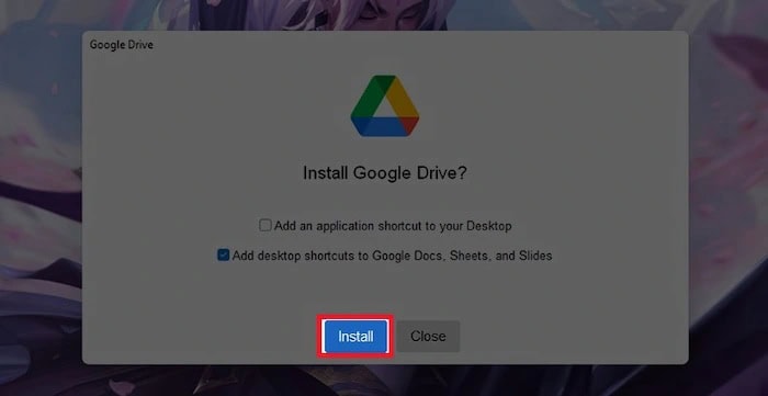 Bạn hãy mở file cài đặt vừa tải về (GoogleDriveSetup.exe trên Windows hoặc file .dmg trên Mac). Sau đó, bạn chọn Install để hệ thống tự động cài đặt ứng dụng.