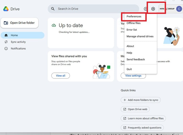 – Bước 1: Mở ứng dụng Google Drive trên máy tính và nhấn truy cập vào mục Preferences (Tùy chọn) thông qua biểu tượng bánh răng (⚙). Sau đó, bạn hãy chọn Preferences để mở phần cài đặt.