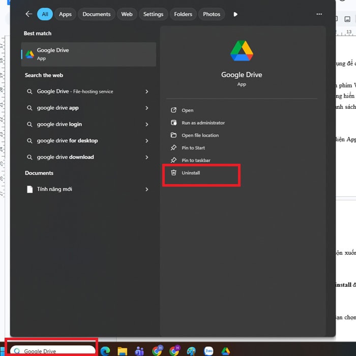 – Bước 2: Khi biểu tượng ứng dụng Google Drive xuất hiện trong danh sách kết quả, bạn nhấn chuột phải vào tên ứng dụng và chọn Uninstall (Gỡ cài đặt).