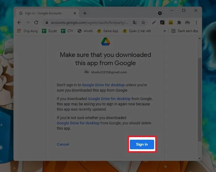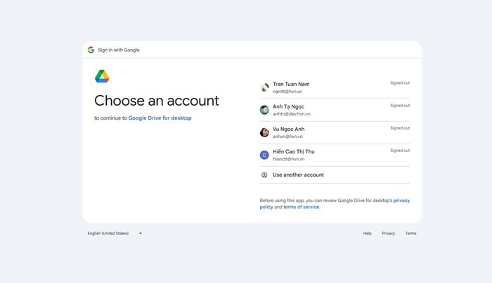 Trình duyệt sẽ mở ra và yêu cầu bạn đăng nhập tài khoản Google. Bạn cần chọn đúng tài khoản mà bạn muốn liên kết Drive với máy tính.