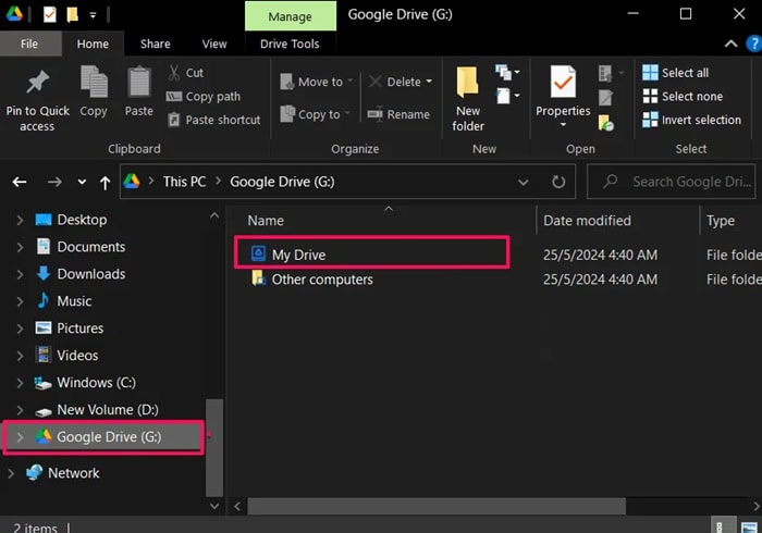 Mở File Explorer (Windows) hoặc Finder (Mac) >> Truy cập thư mục Google Drive và chọn My Drive >> Kiểm tra các file và thư mục đã xuất hiện đầy đủ.