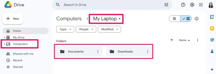Truy cập Google Drive trên web >> Chọn mục Máy tính (Computer) ở thanh bên trái >> Nhấn vào tên thiết bị (ví dụ: My Laptop) để xem các thư mục đã được liên kết.
